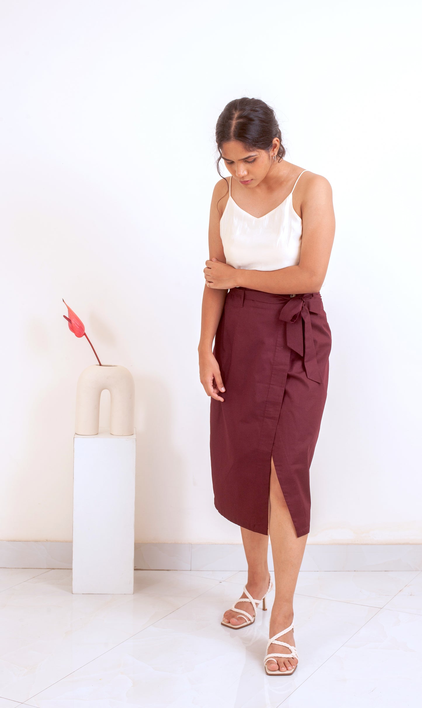 A smart casual by character, our On Time Wrap Skirt is cut in a slant slit. A classic wrap around in a sumptuous ramie linen, dyed in the deepest beetroot hue. Easy to put on & even easier fit to style. Great to elevate any look. All while keeping it easy & sharp. Ramie linen is a promise of quality that will endure seasons. Also, feels lovely on skin.