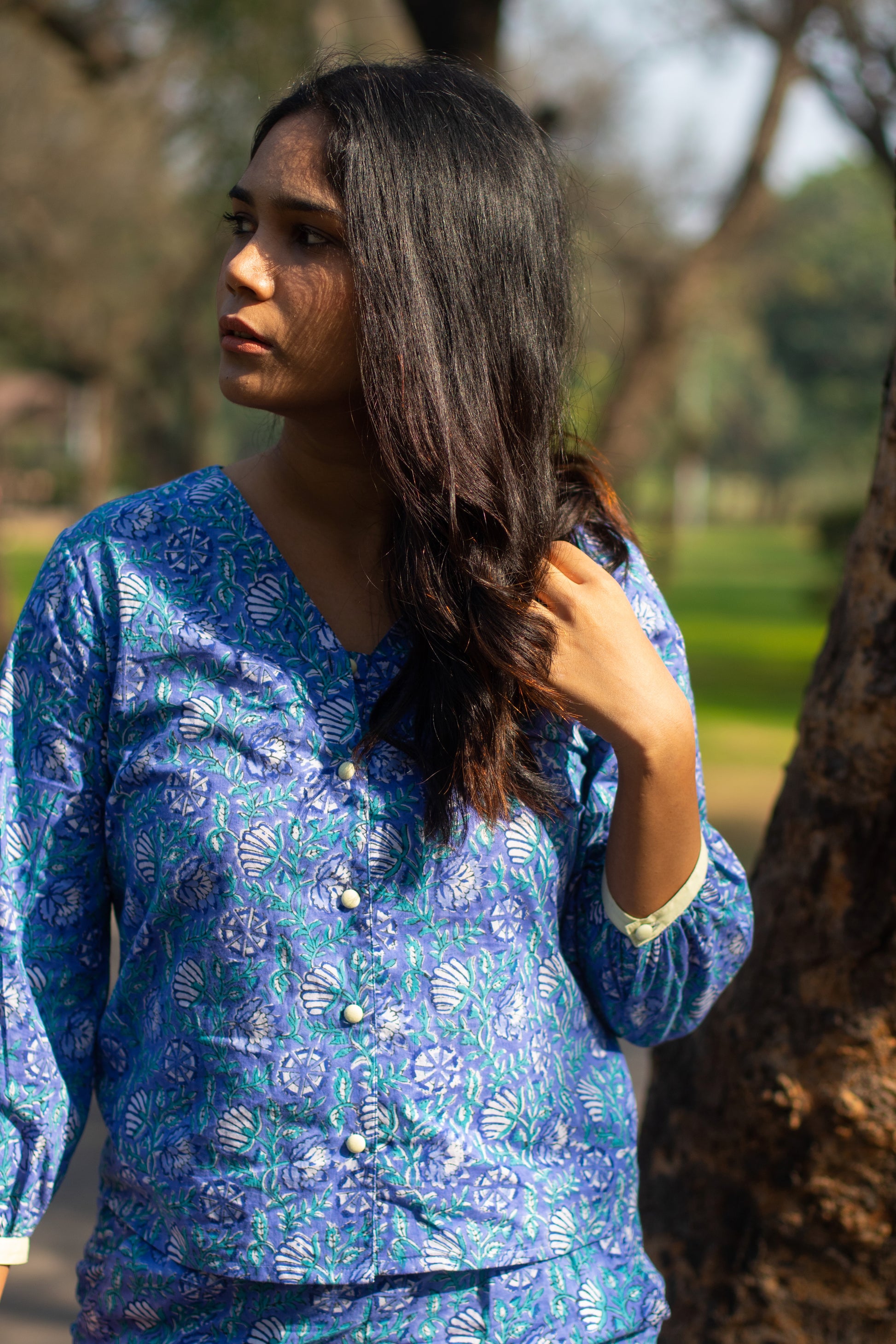 Crafted with meticulously hand-block printed cotton, the Rain Top exudes effortless comfort. Embellished with striking Butter Yellow cuffs and elegant fabric buttons, this V-neck top can elevate any ensemble.