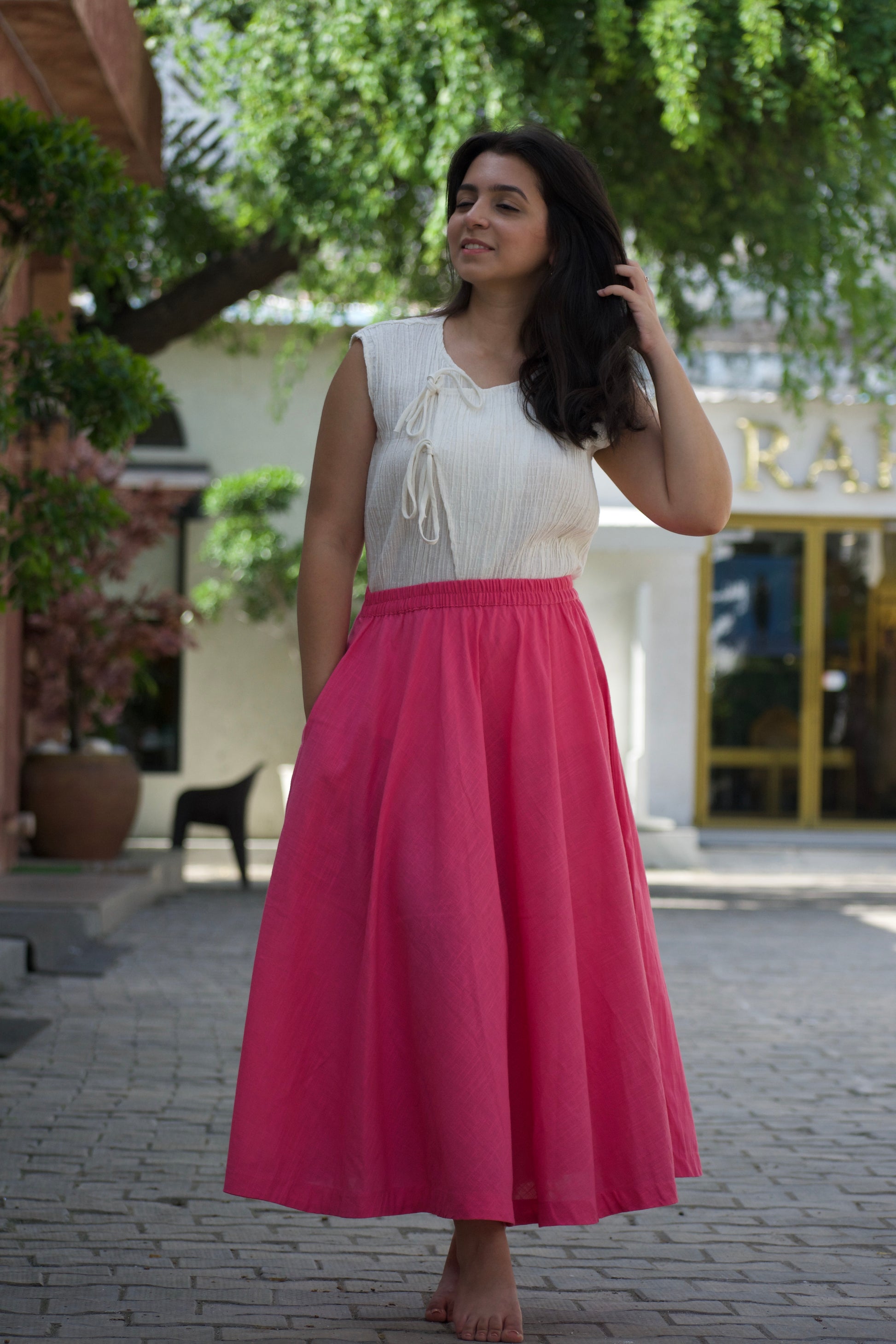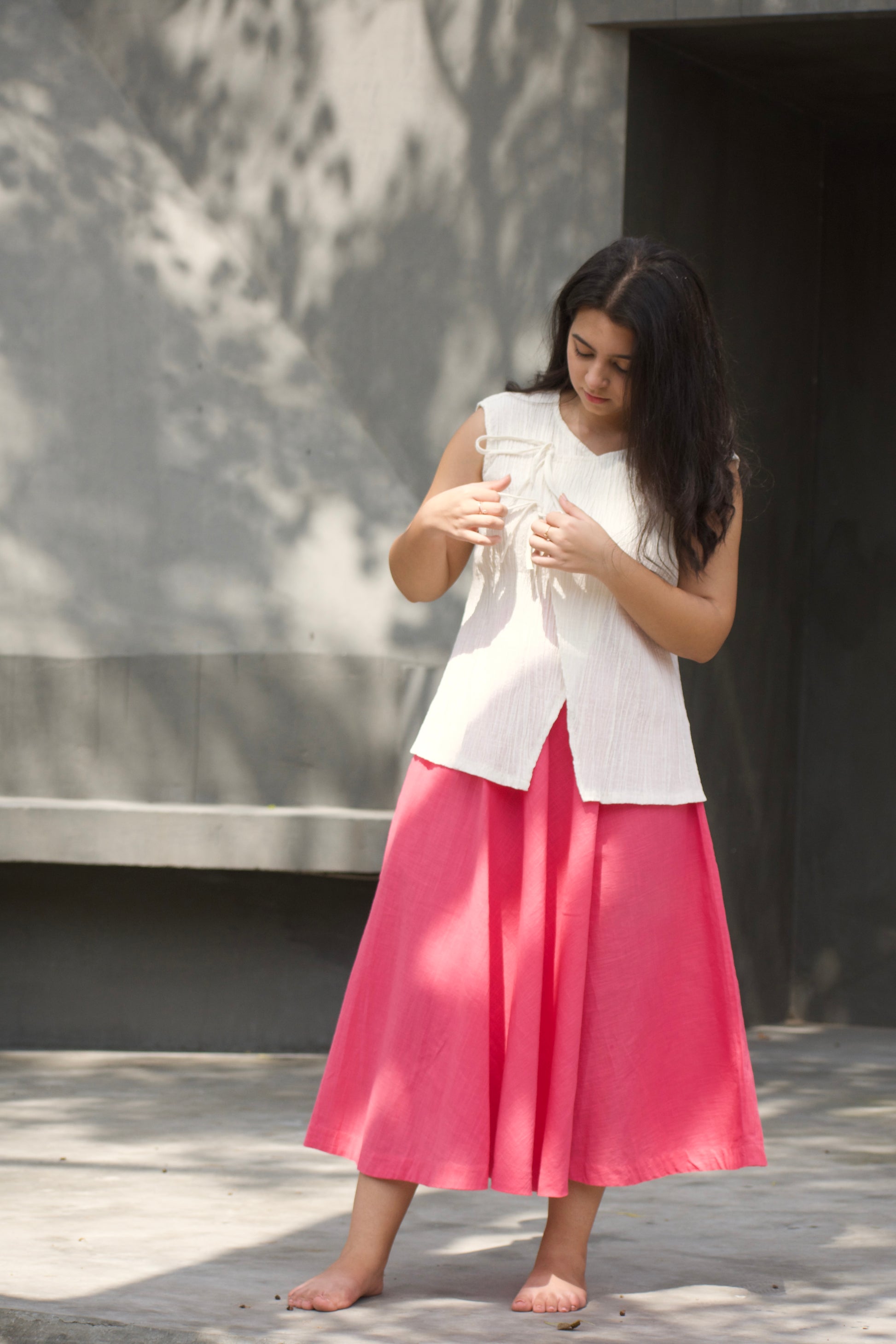 The Tokyo Set blends two of our favourite fabrics - crushed cotton and slub, into a pairing that’s light, joyful, and easy to live in. A little bit playful, a little bit thoughtful - just like the city it's named after. the tie-up details, the fresh white cotton, the happy pink skirt - all stitched to brighten up your everyday edits.